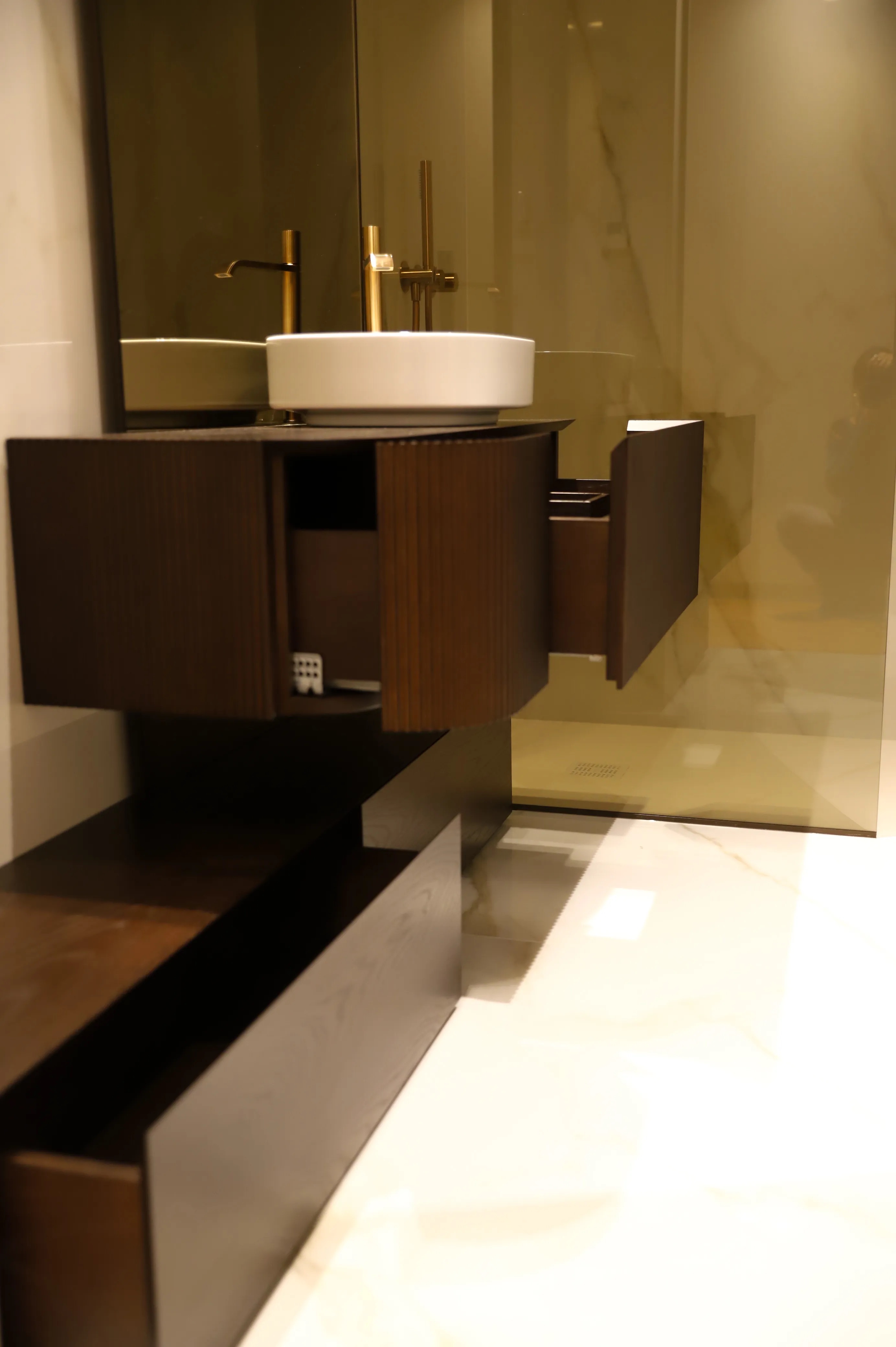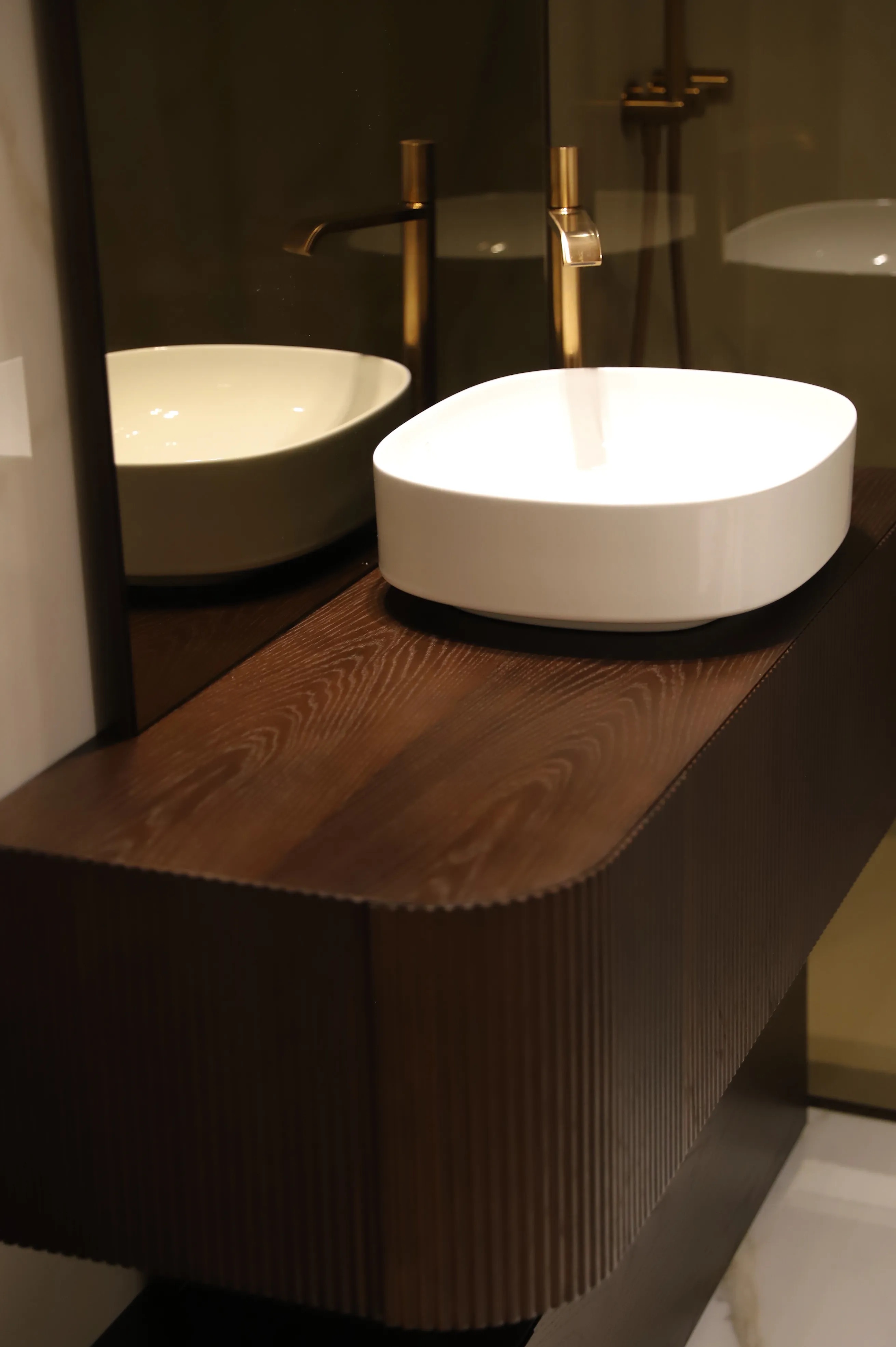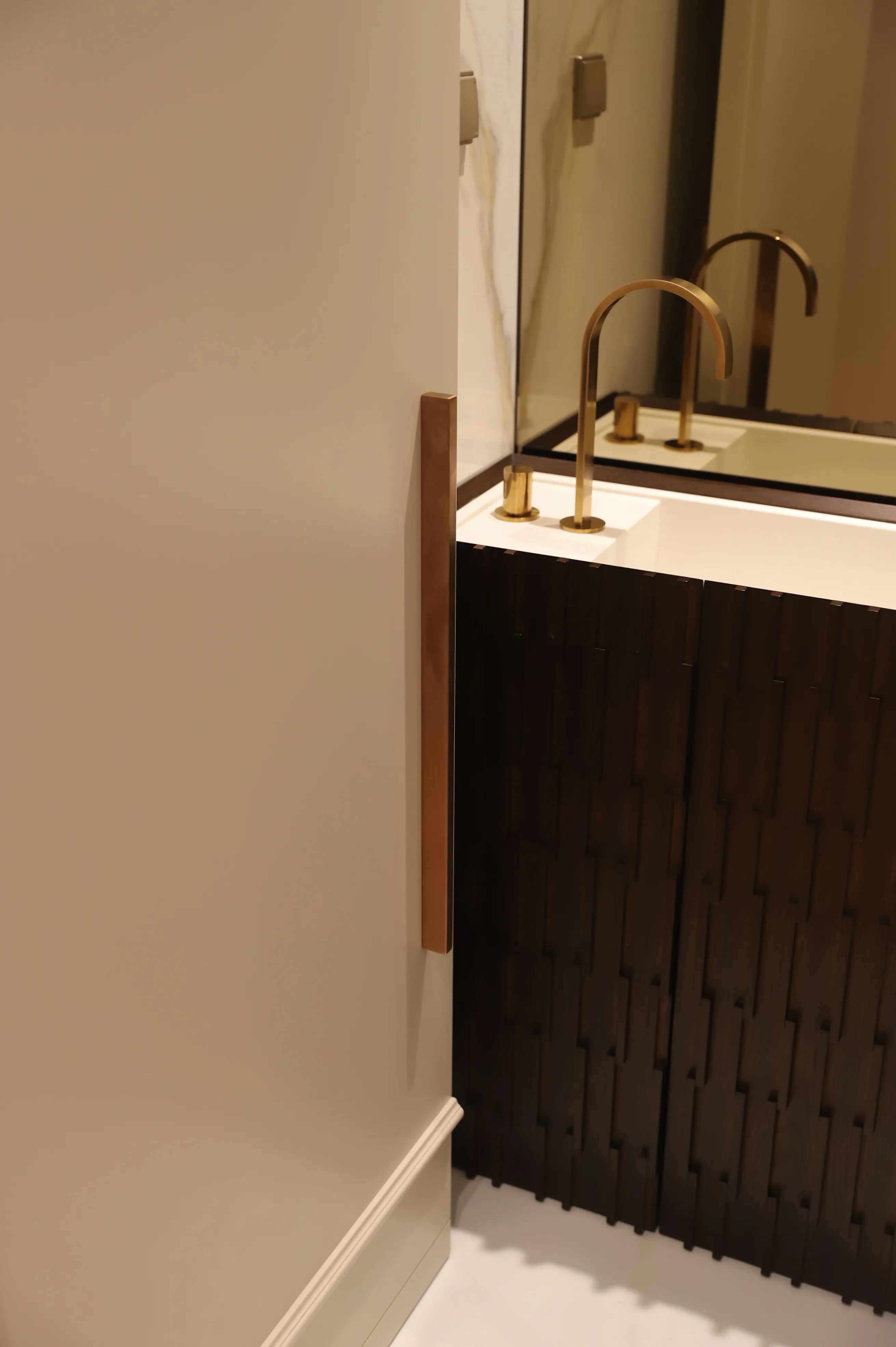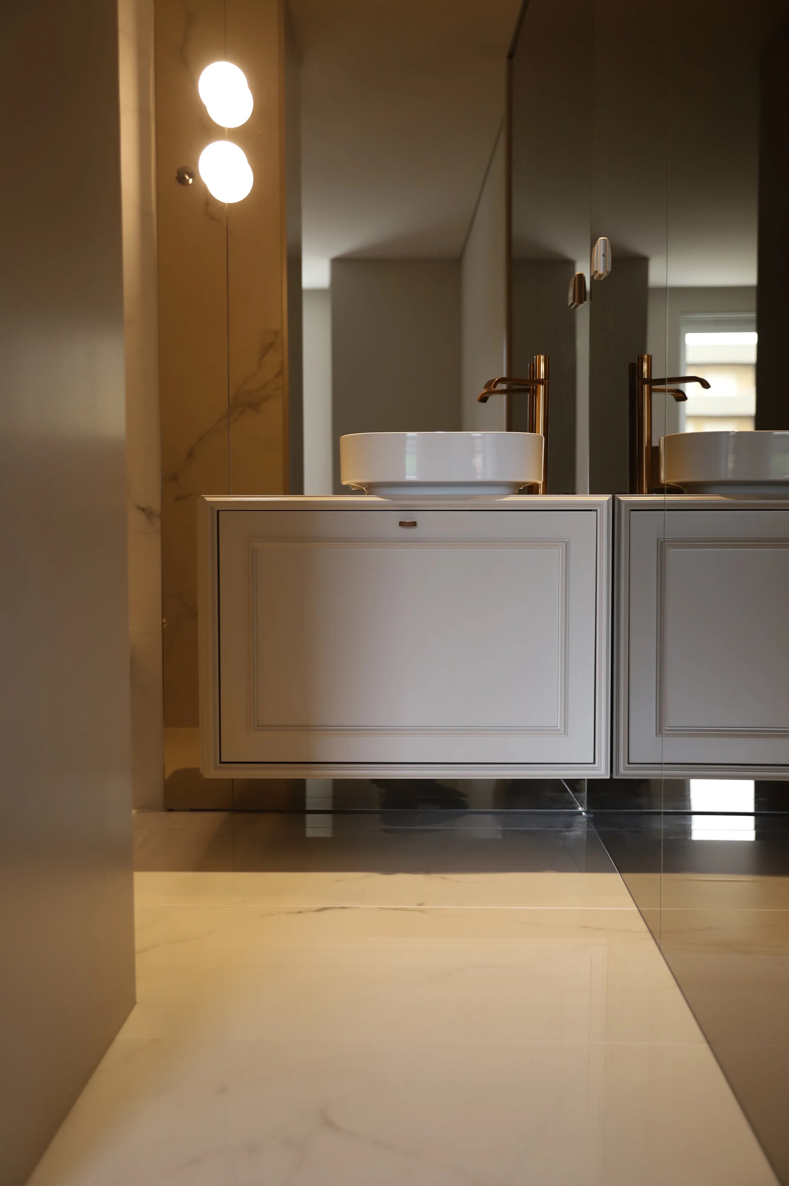 Os espaços de banho seguem a mesma lógica de desenho e execução: desde o móvel suspenso em MDF lacado com molduras e puxador em latão, ao móvel em carvalho com ripado, com lavatório em silestone, reforçando a combinação entre madeira trabalhada e superfícies minerais. O conjunto é rematado por escolhas consistentes, como o pavimento lamelado em madeira de afizelia, que acrescenta calor e presença, mantendo o caráter sofisticado e intemporal da casa.