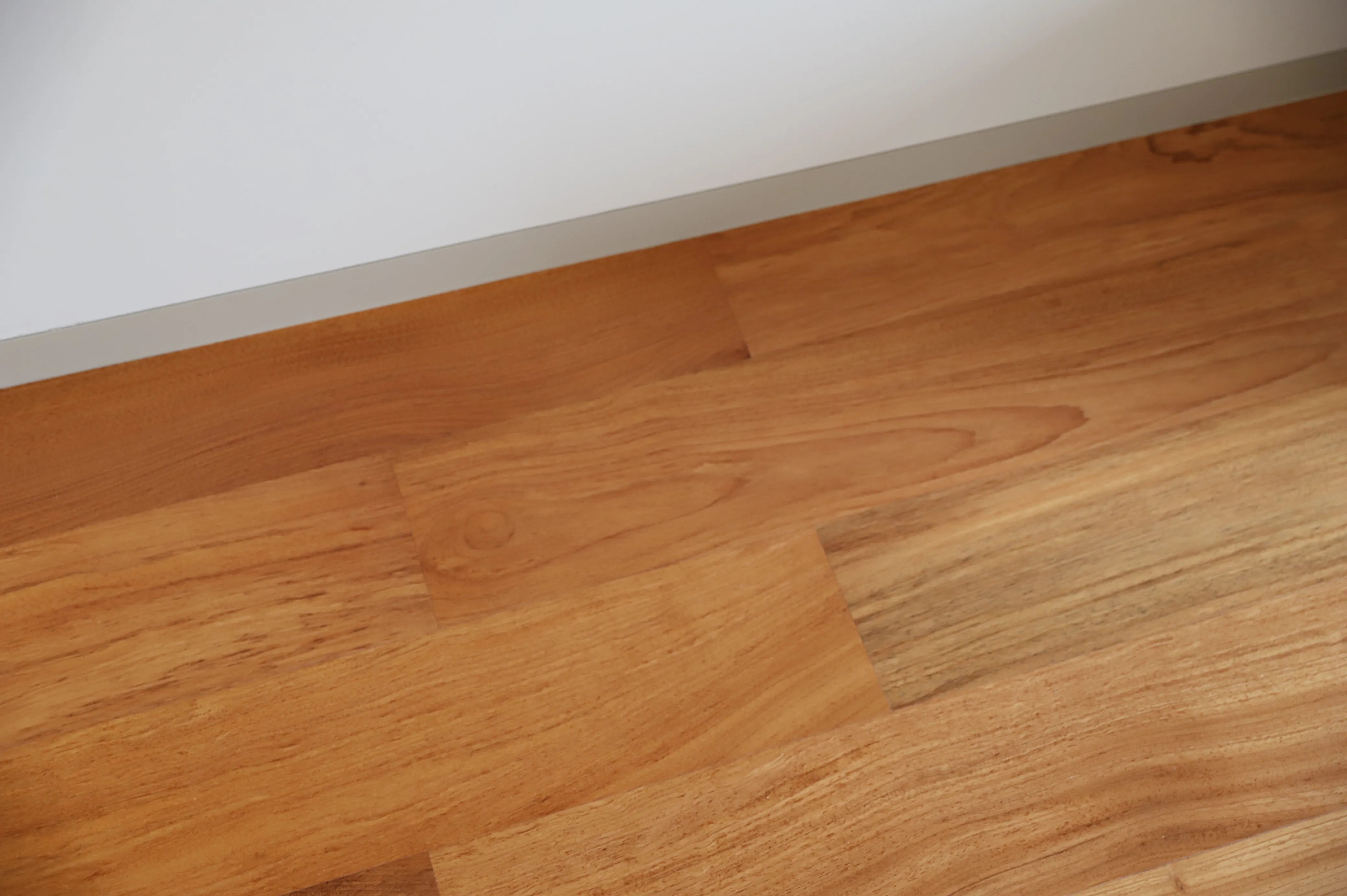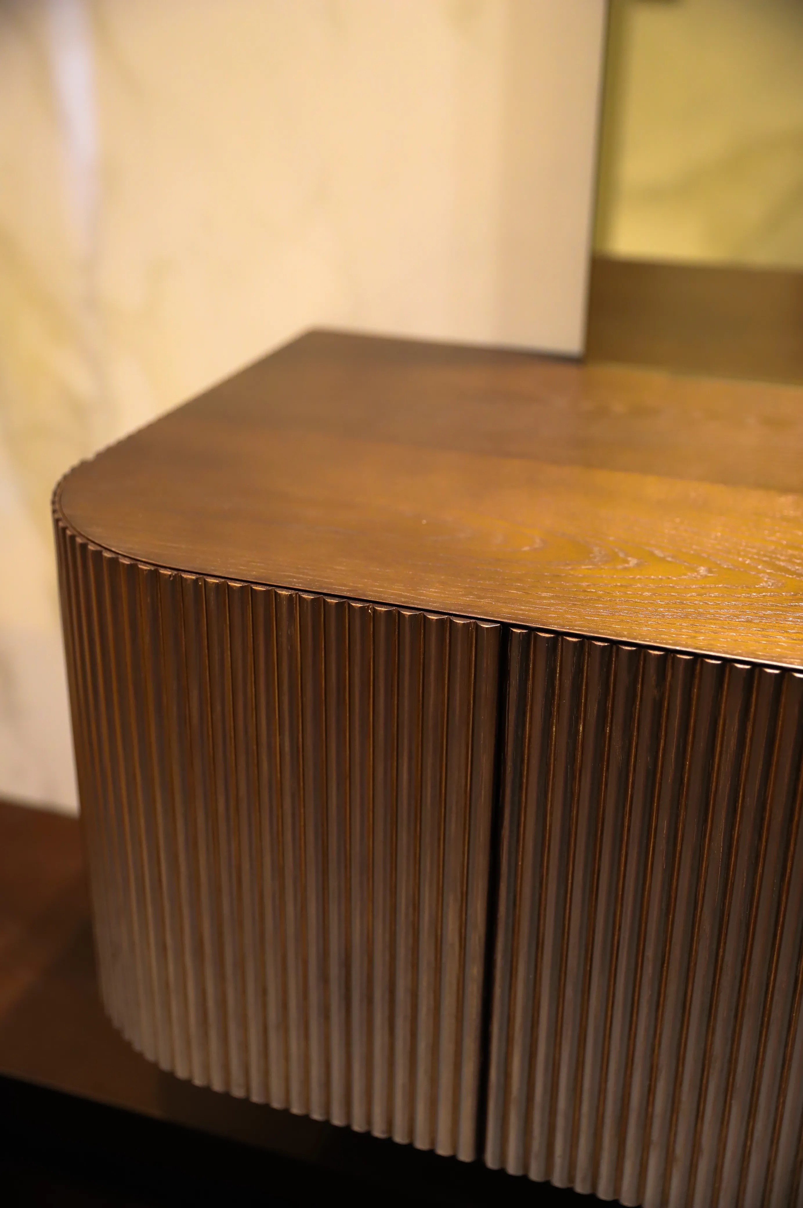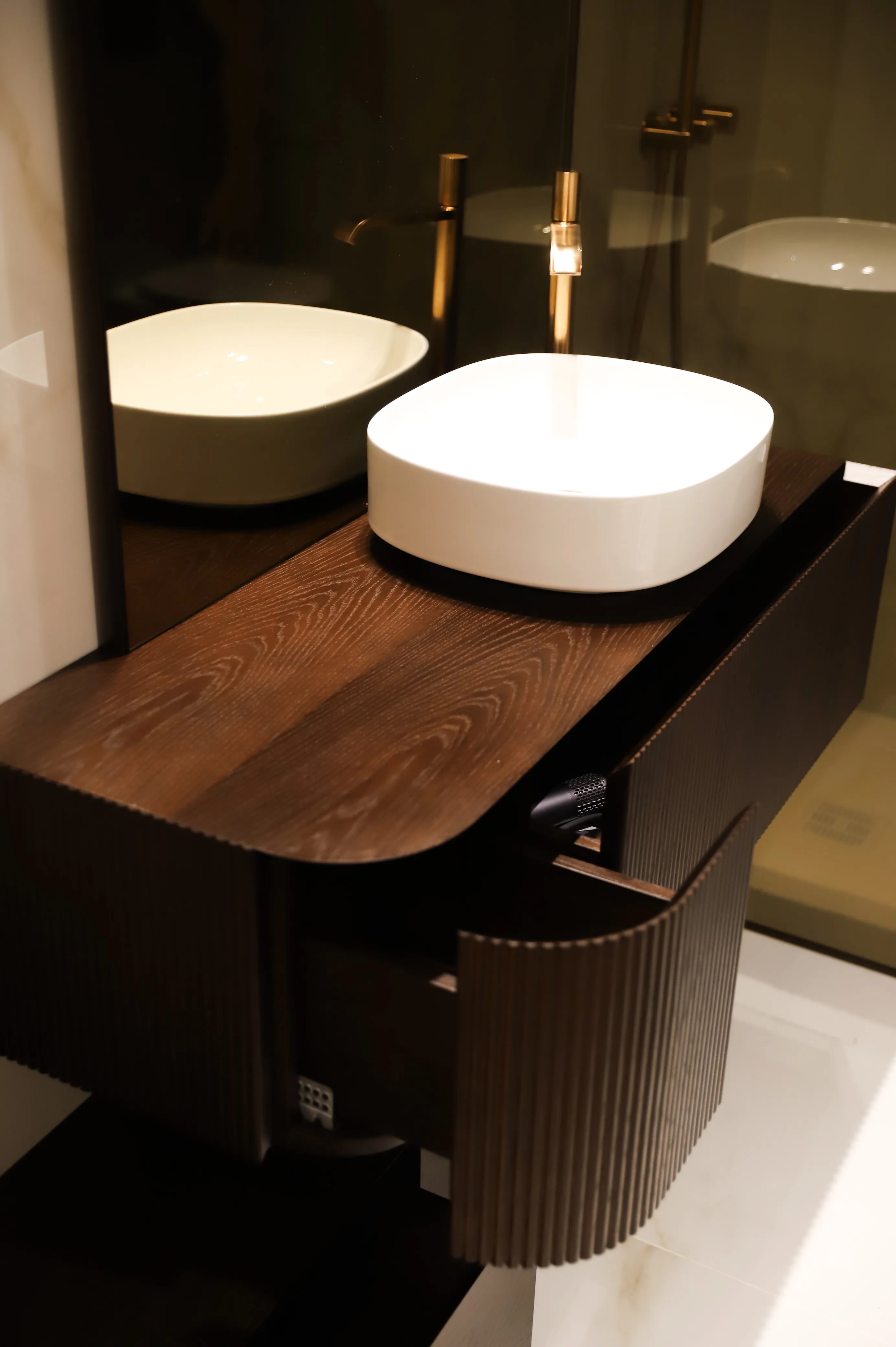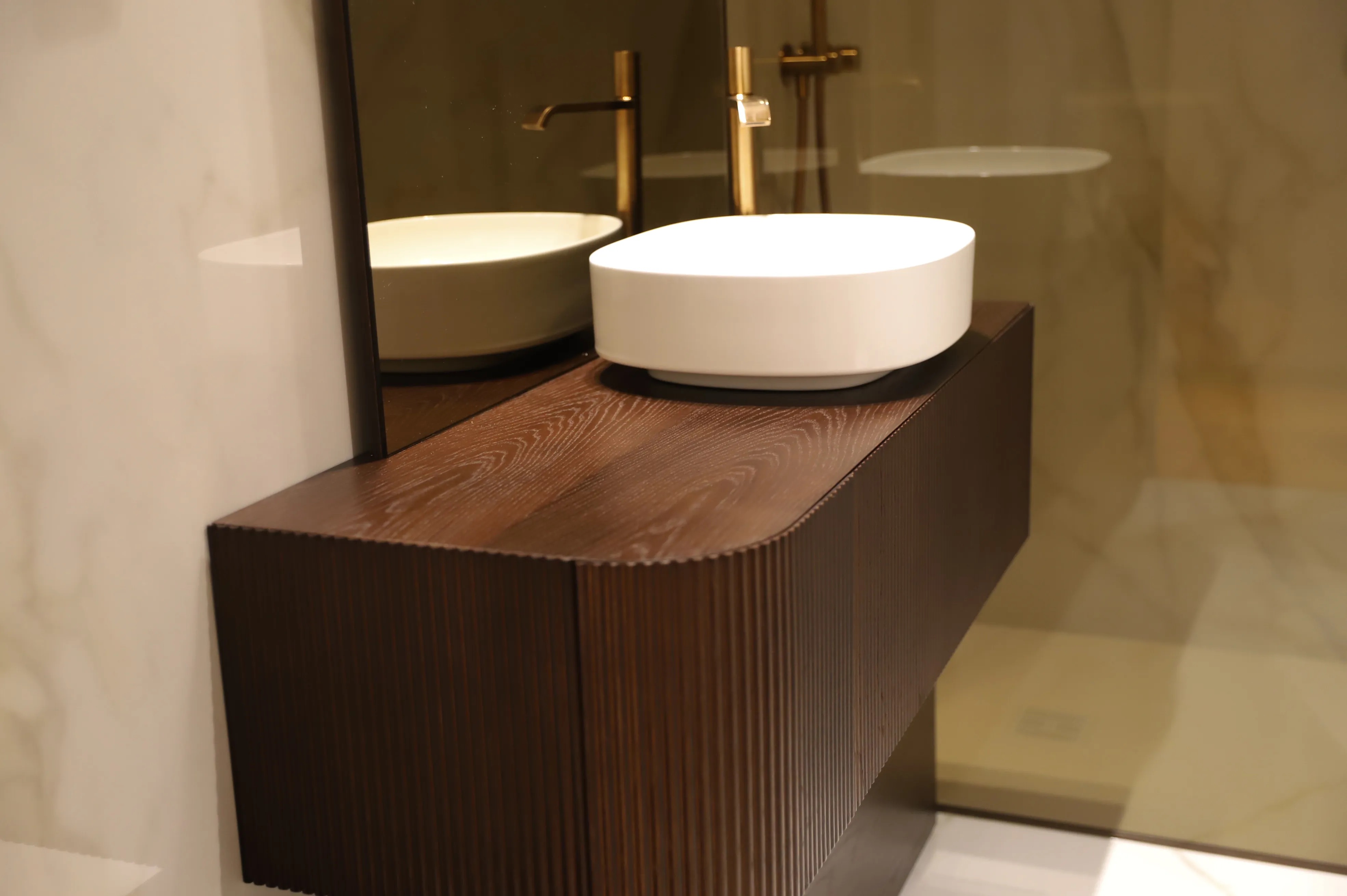 Os espaços de banho seguem a mesma lógica de desenho e execução: desde o móvel suspenso em MDF lacado com molduras e puxador em latão, ao móvel em carvalho com ripado, com lavatório em silestone, reforçando a combinação entre madeira trabalhada e superfícies minerais. O conjunto é rematado por escolhas consistentes, como o pavimento lamelado em madeira de afizelia, que acrescenta calor e presença, mantendo o caráter sofisticado e intemporal da casa.