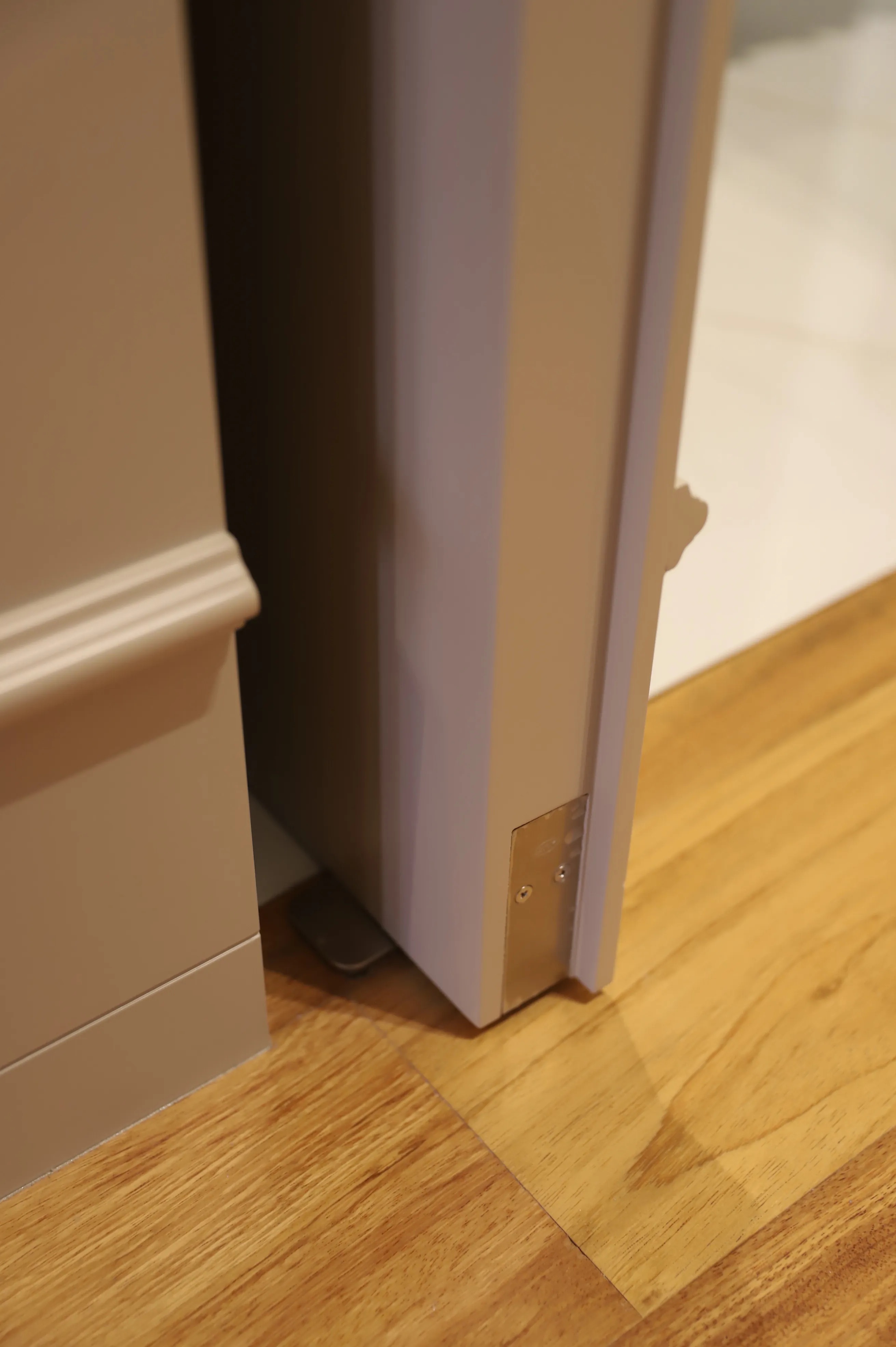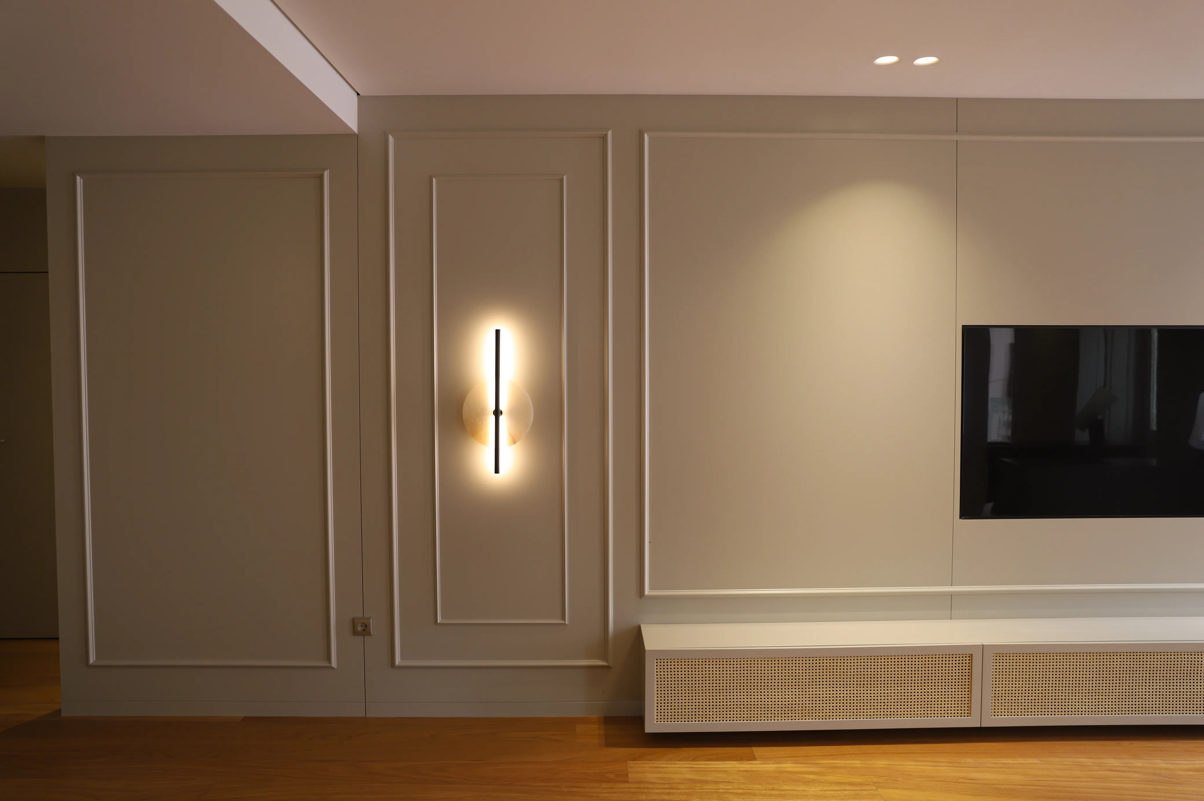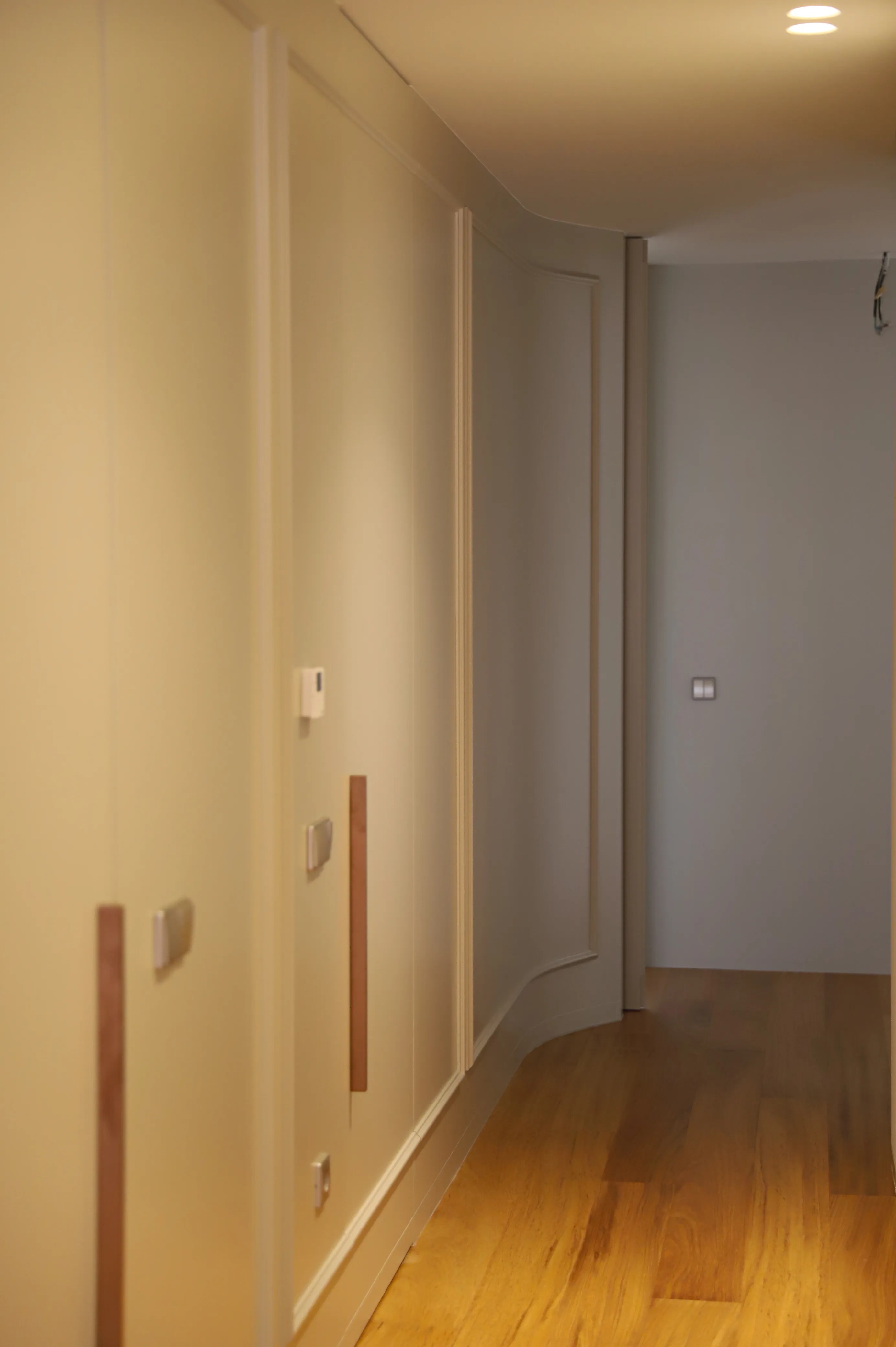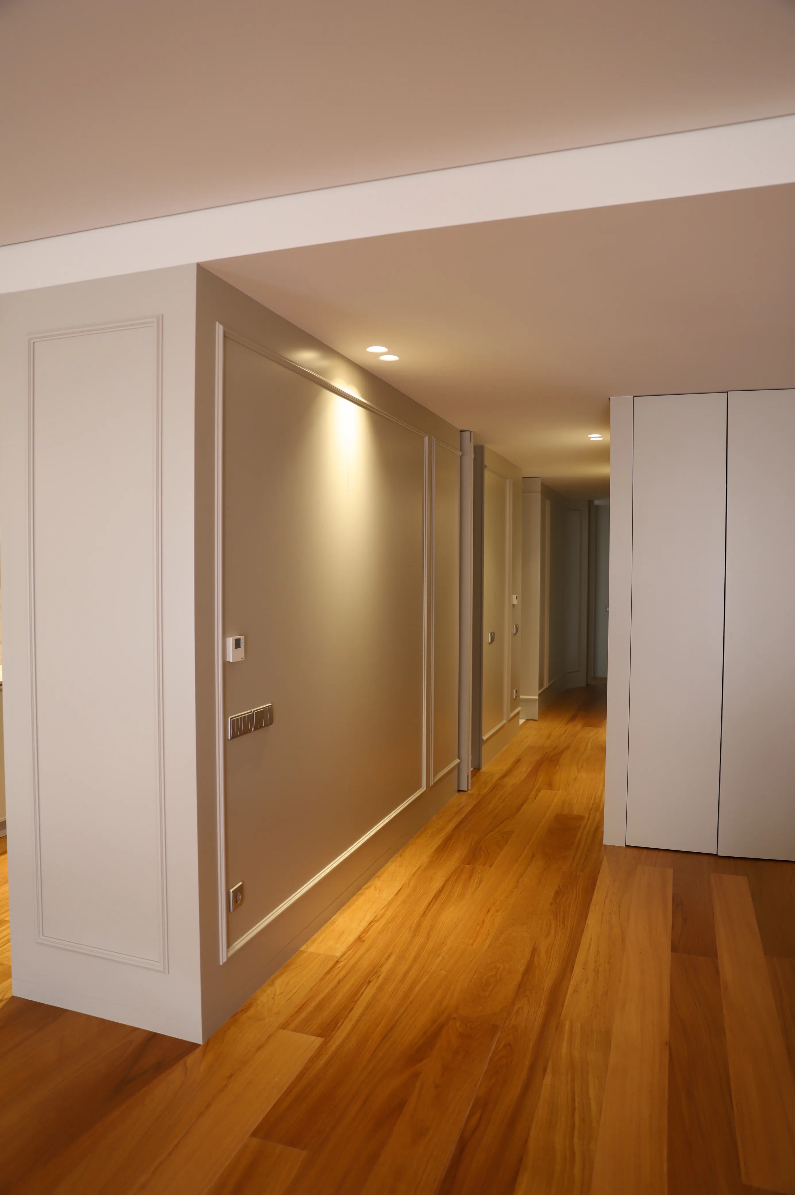 A envolvência continua nas paredes forradas a MDF lacado mate com moldura, criando uma linguagem arquitectónica elegante e contínua, que valoriza a luz natural e reforça a sensação de harmonia entre as divisões.