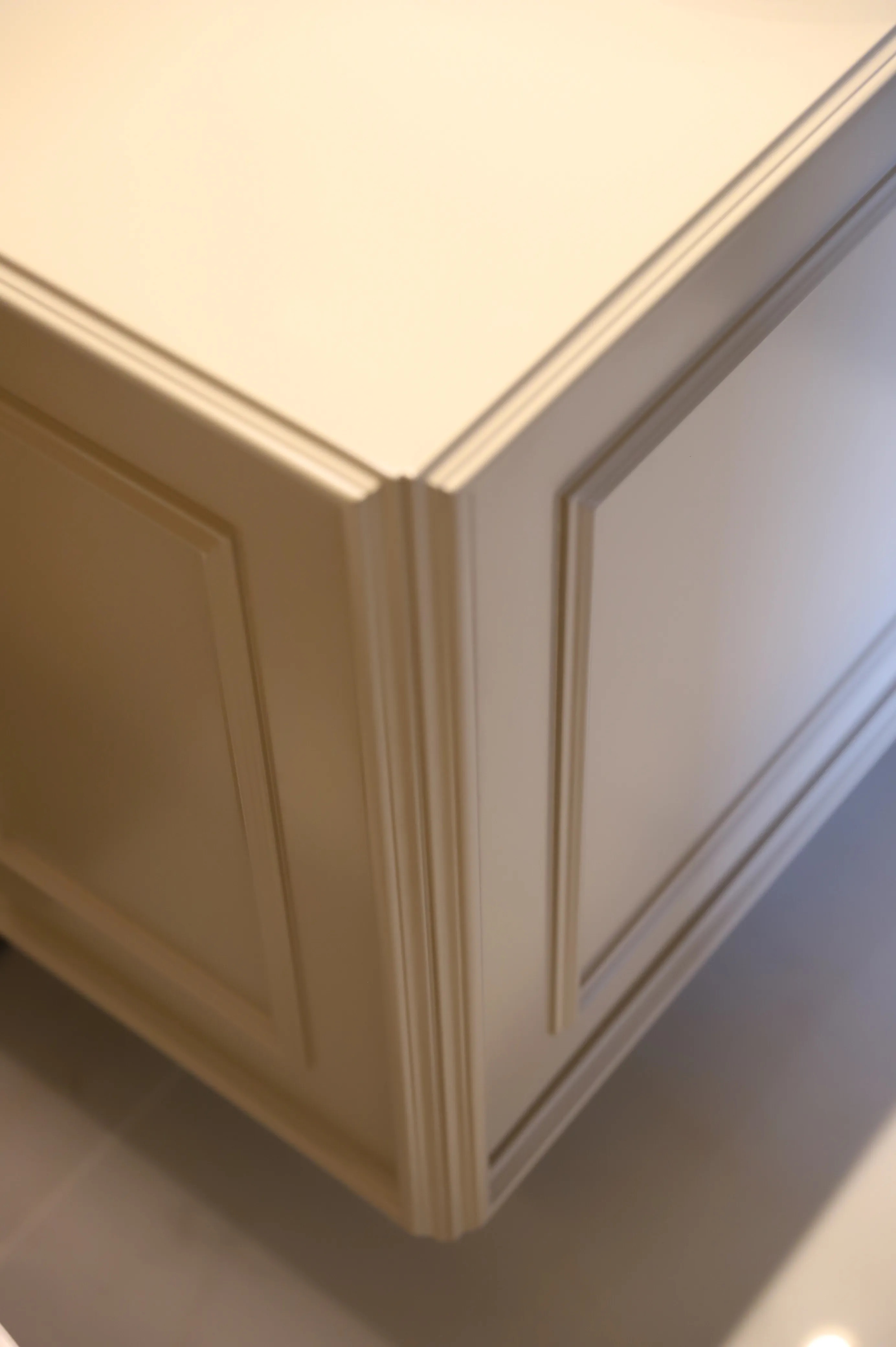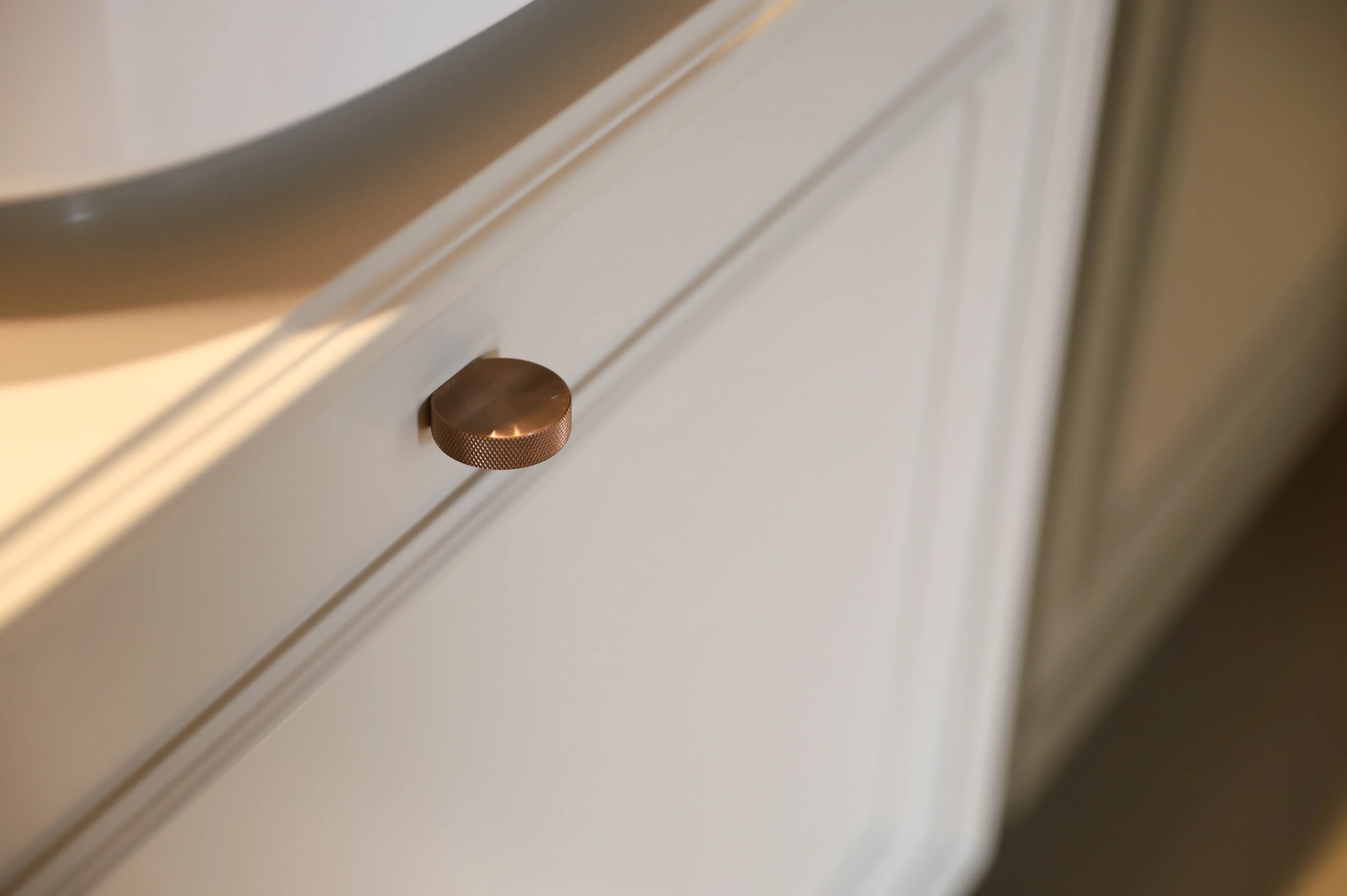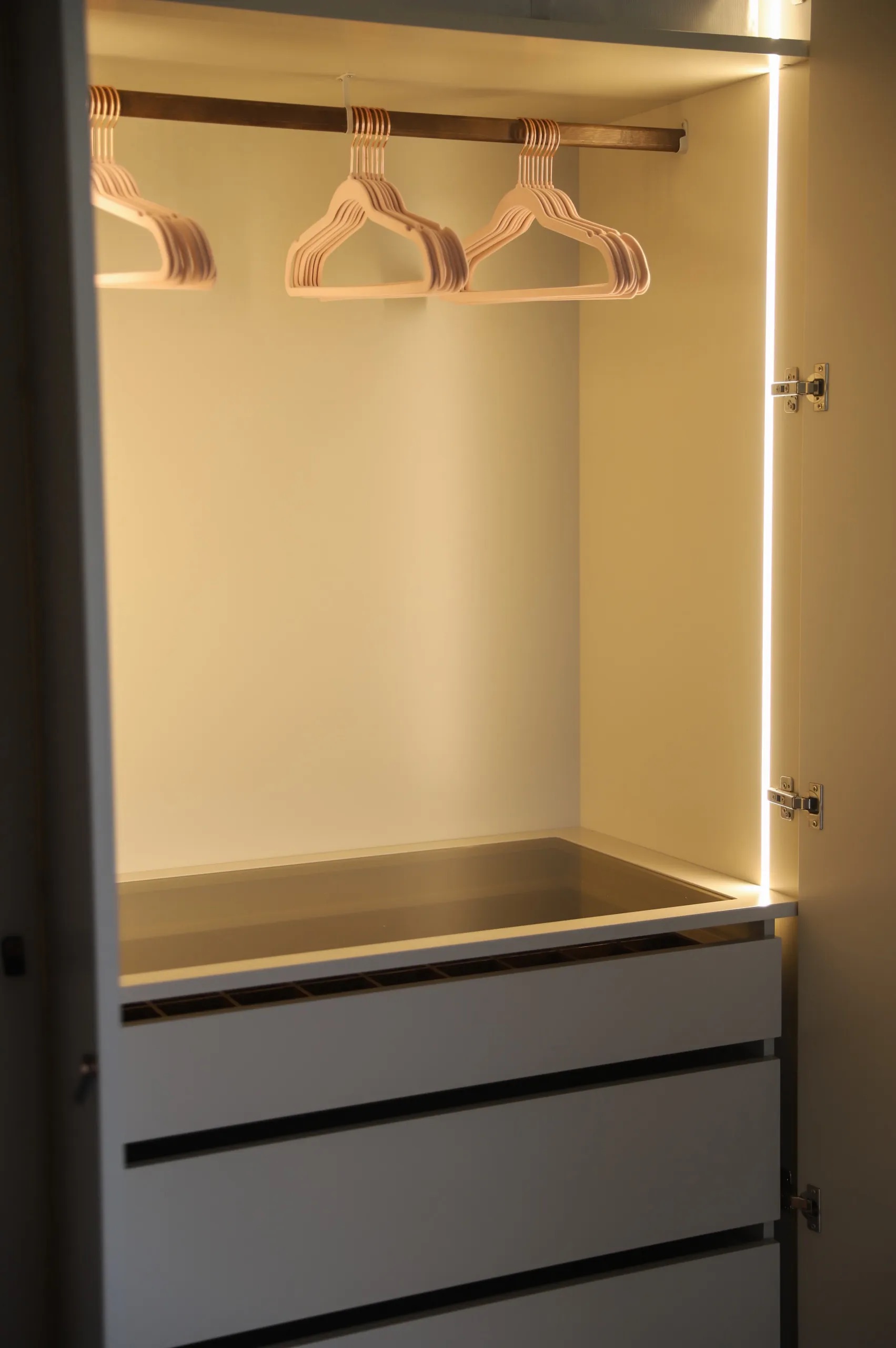 Nas peças de mobiliário, o conforto e a durabilidade encontram-se nos materiais e ferragens: a cozinha foi executada com MDF hidrófugo lacado (interior e exterior), com tampo e parede em quartzite Perla Santy polido e ferragens Blum com soft close, garantindo resistência e suavidade no uso diário. Na sala, o móvel de TV integra portas em palhinha natural, trazendo textura e um apontamento artesanal que equilibra a sobriedade do lacado. Nos quartos, os roupeiros lacados com puxadores em perfil de latão elevam o desenho com um detalhe nobre, enquanto o interior foi pensado ao pormenor: iluminação LED, soluções de organização e gavetas personalizadas estofadas, também com ferragens Blum.