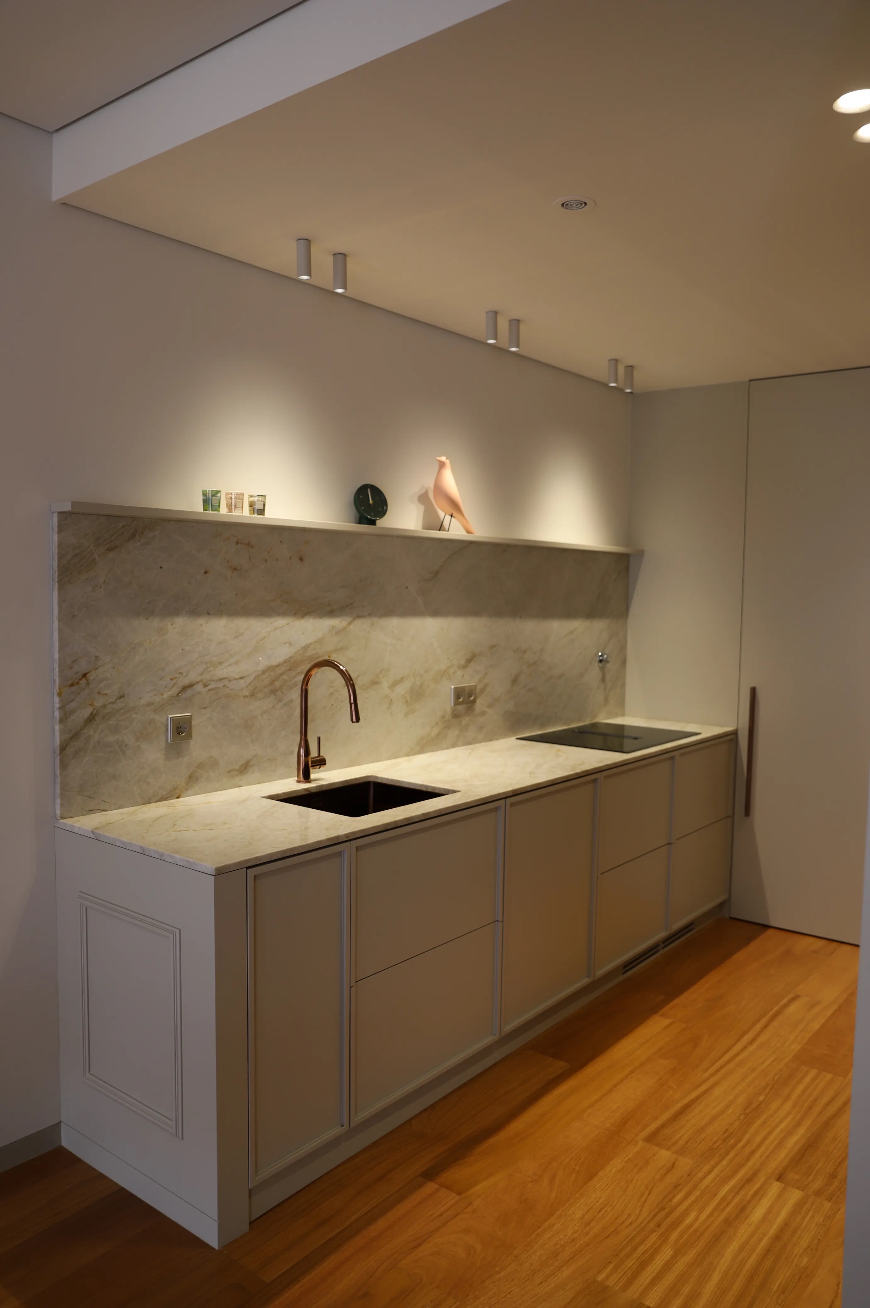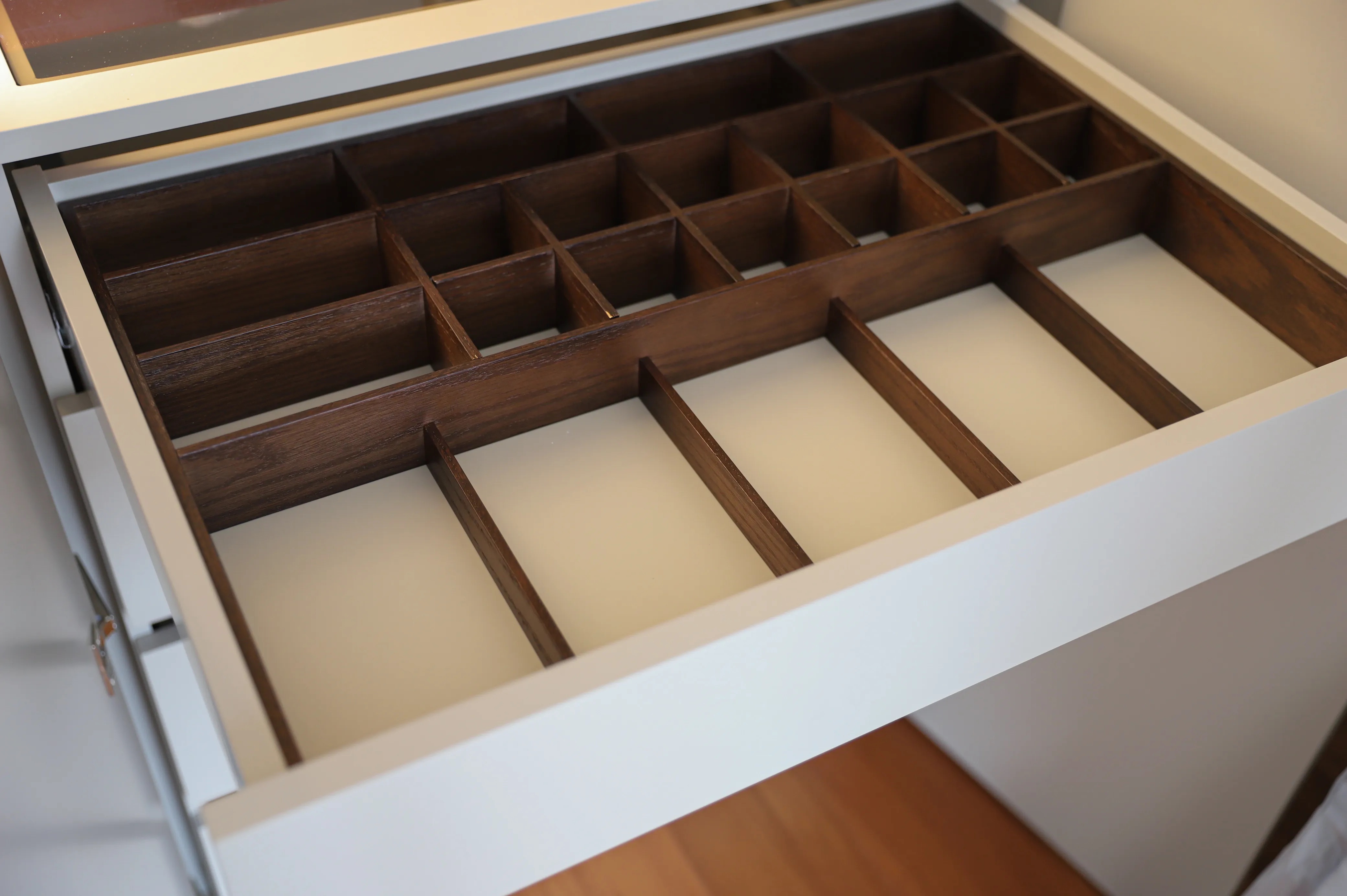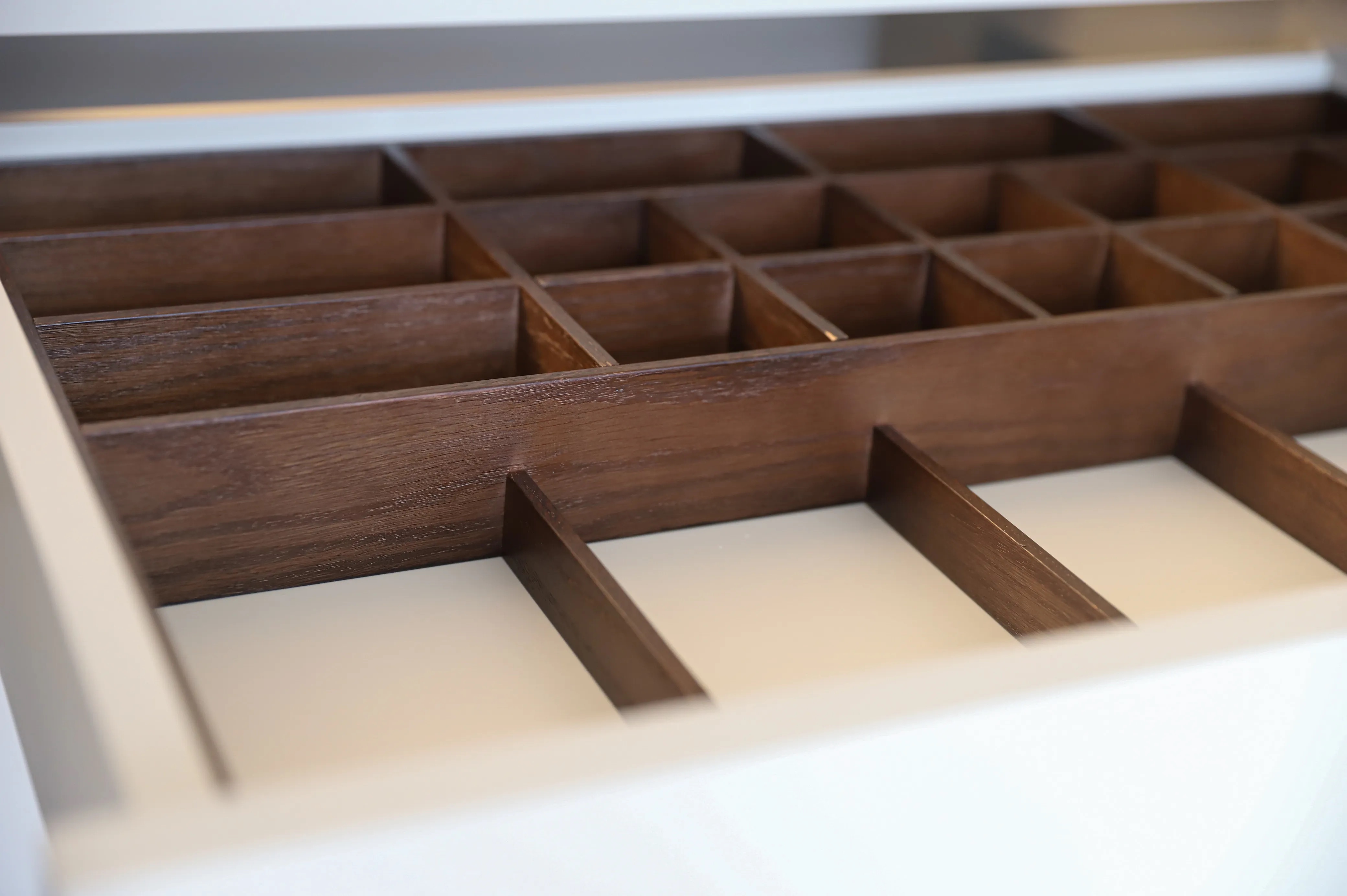 Nas peças de mobiliário, o conforto e a durabilidade encontram-se nos materiais e ferragens: a cozinha foi executada com MDF hidrófugo lacado (interior e exterior), com tampo e parede em quartzite Perla Santy polido e ferragens Blum com soft close, garantindo resistência e suavidade no uso diário. Na sala, o móvel de TV integra portas em palhinha natural, trazendo textura e um apontamento artesanal que equilibra a sobriedade do lacado. Nos quartos, os roupeiros lacados com puxadores em perfil de latão elevam o desenho com um detalhe nobre, enquanto o interior foi pensado ao pormenor: iluminação LED, soluções de organização e gavetas personalizadas estofadas, também com ferragens Blum.