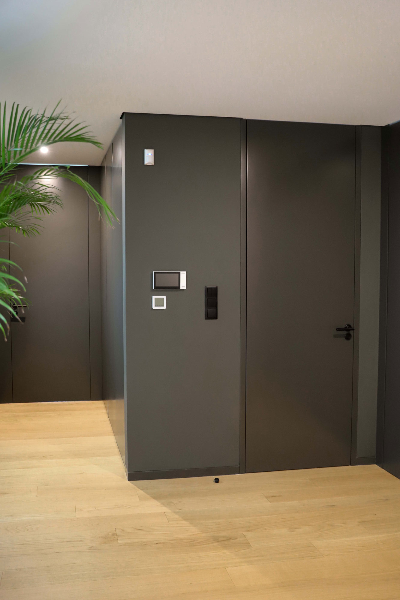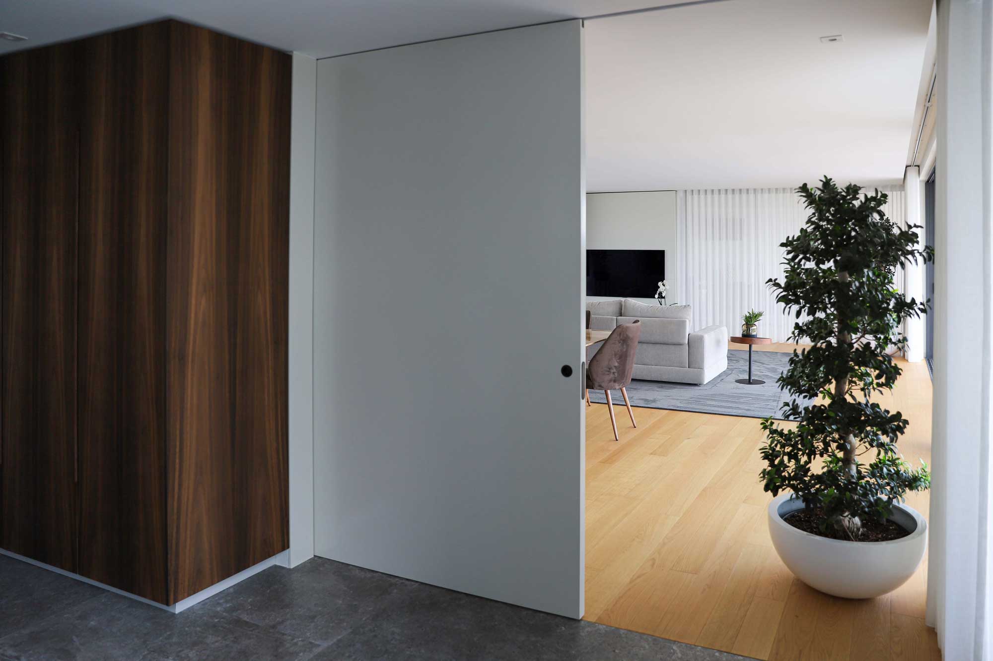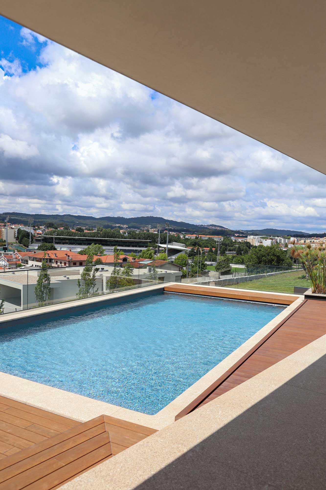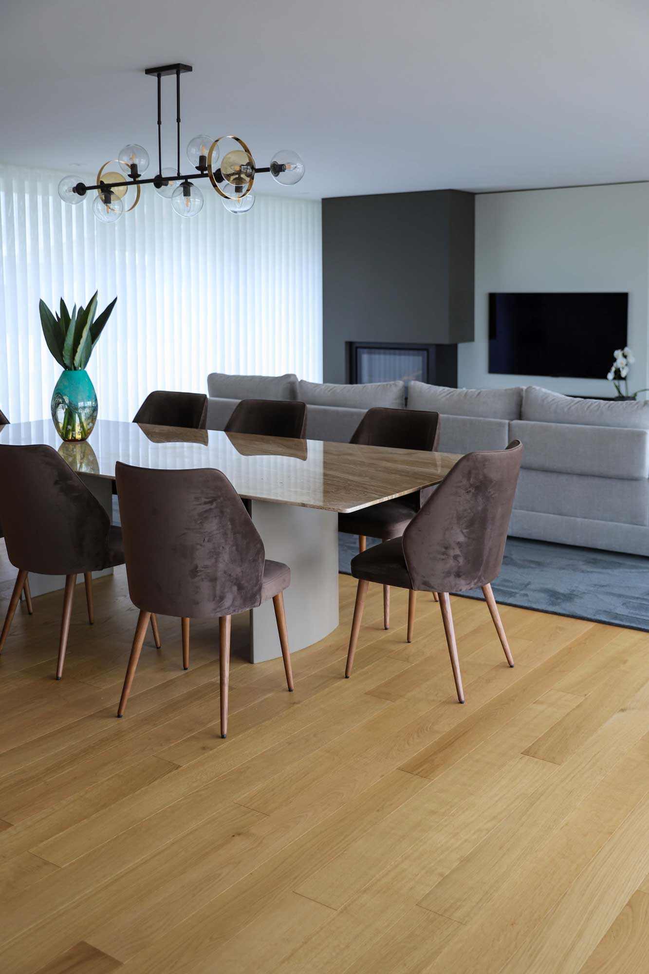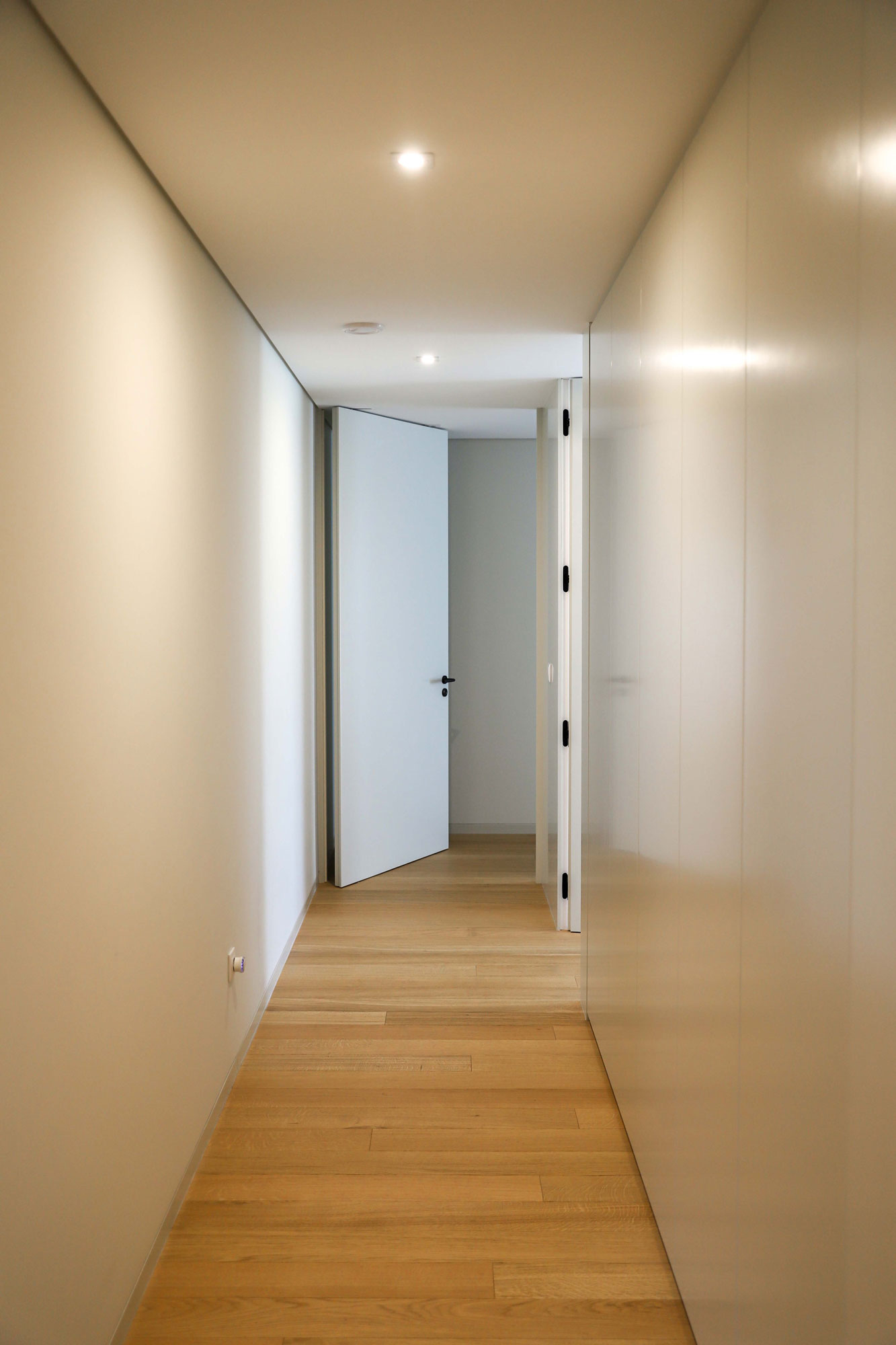 Nesta moradia particular foram executados projetos de carpintaria e mobiliário. No interior da moradia, o soalho de carvalho americano confere elegância aos diferentes espaços. As portas internas são de MDF lacado, sendo que a porta da sala de estar possui um sistema de correr altamente funcional e prático.