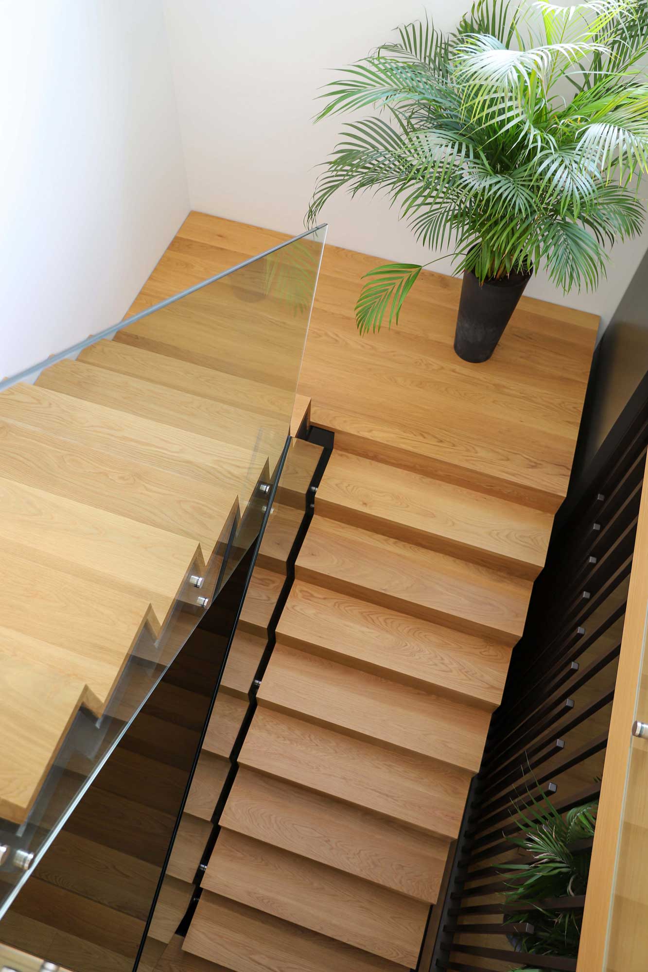 Paras as escadas optou-se pela madeira maciça de carvalho americano e as portas dos quartos com pivot lacado e fechaduras magnéticas oferecem segurança e facilidade de abertura e fecho.