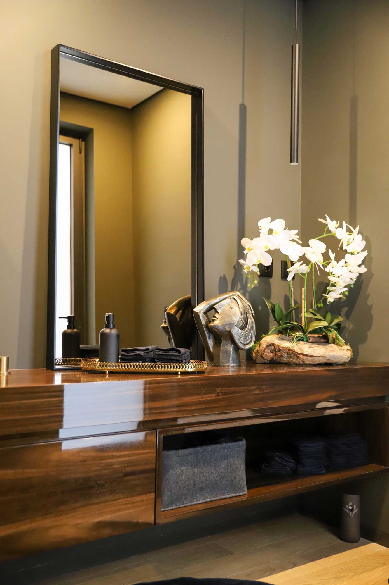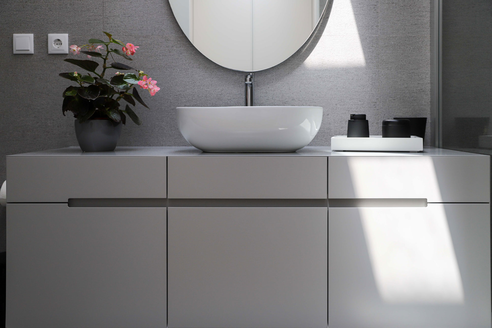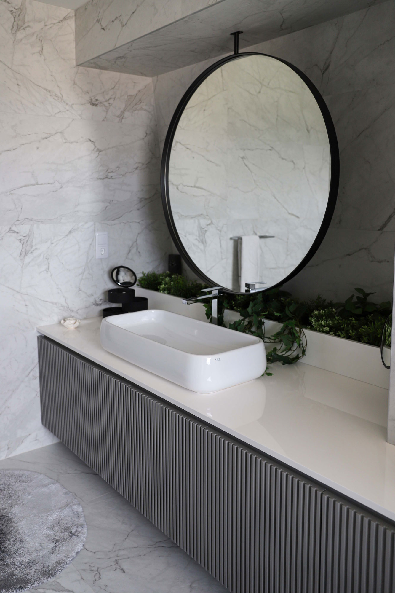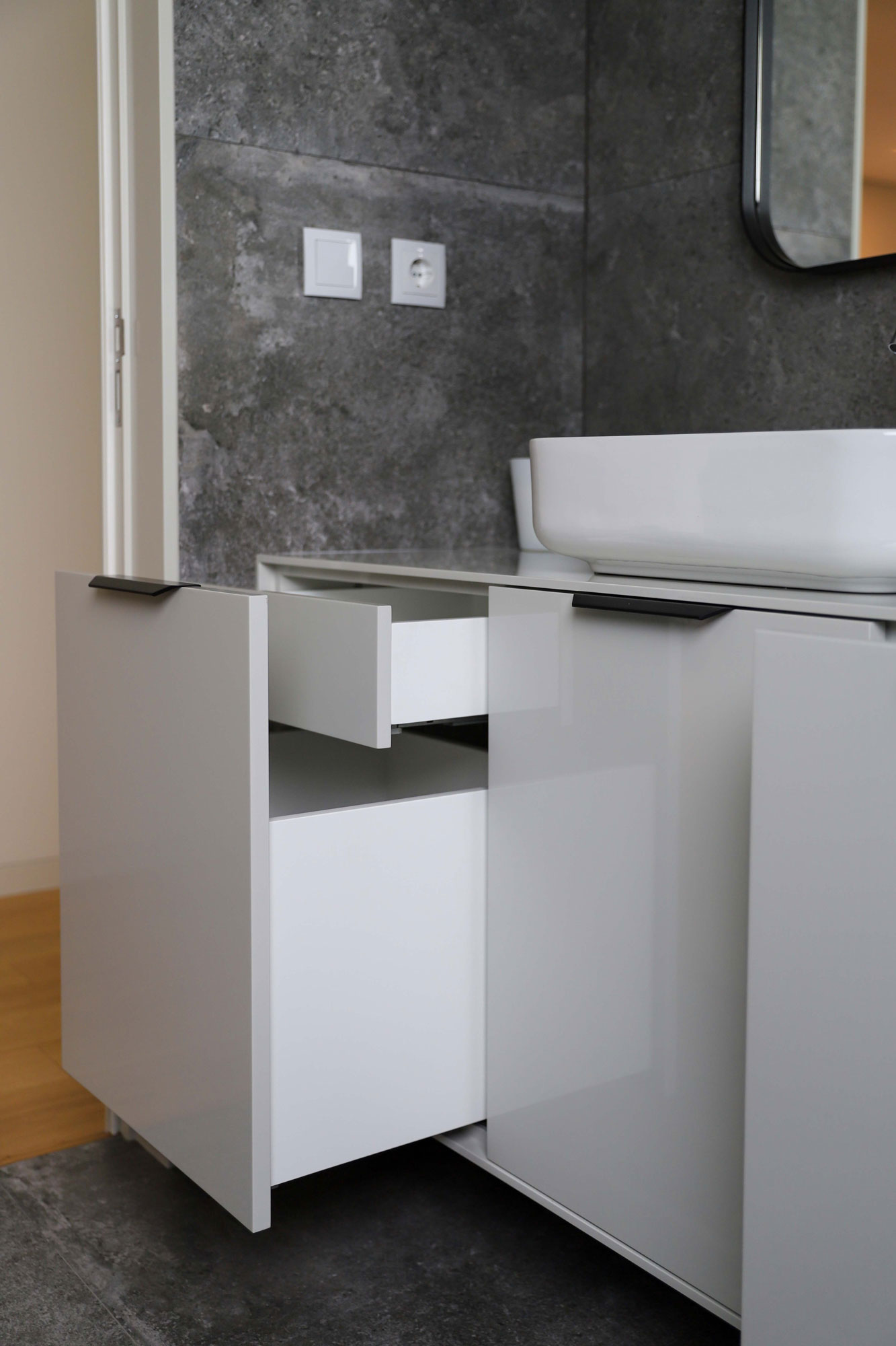 Neste projeto, a Guribema desenhou 4 móveis de WC com apontamentos inovadores, tais como o ripado e puxadores em metal. Os móveis foram produzidos em MDF lacado, à exceção do móvel castanho, onde foi utilizada folha de eucalipto fumado com acabamento envernizado a alto brilho para um toque mais rústico e elegante.