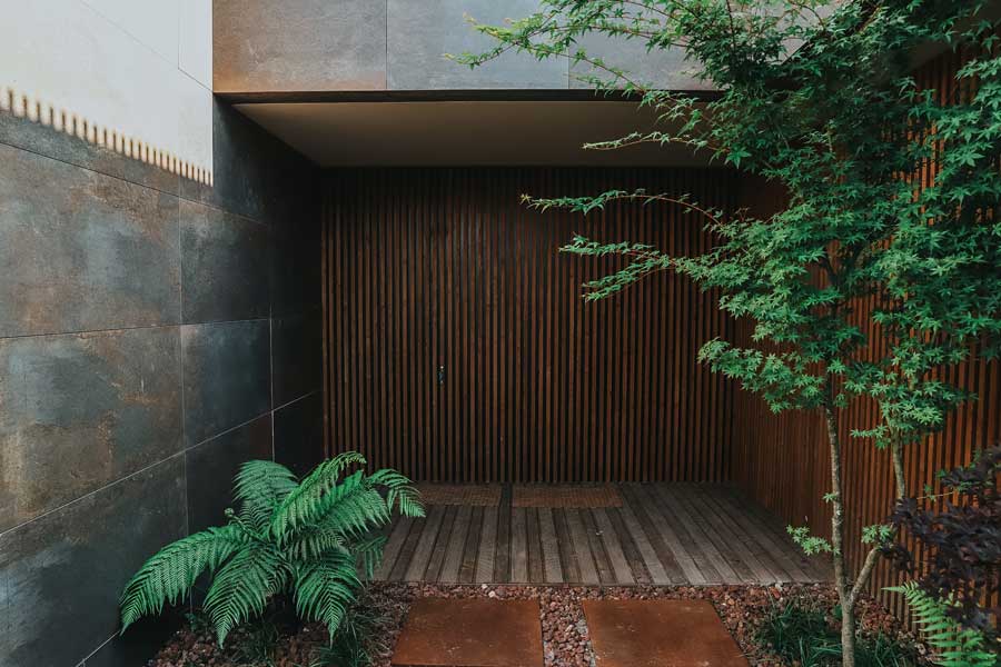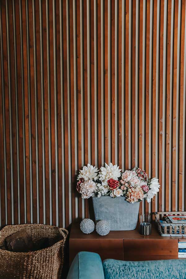 Mobiliários em Nogueira, com acabamentos mate e as aplicações de madeira criptoméria ripadas na vertical criam uma perfeita combinação e beleza em Wcs.